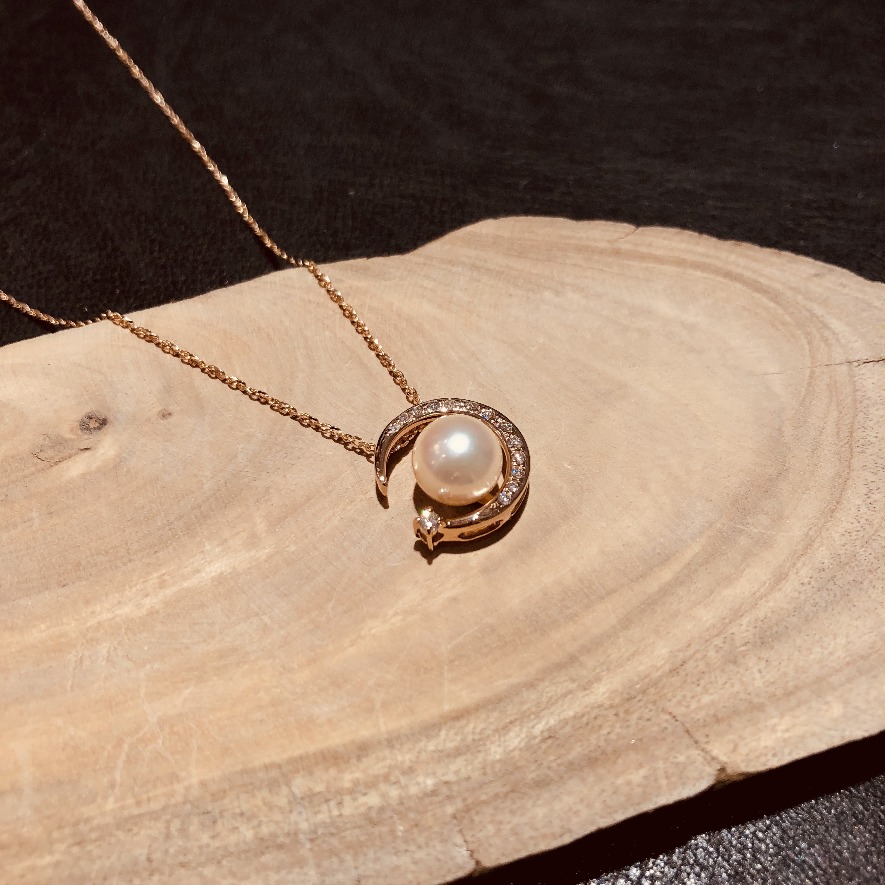 月に乗るようにセッティングされた真珠の輝きを、脇のダイヤが引き立てます。