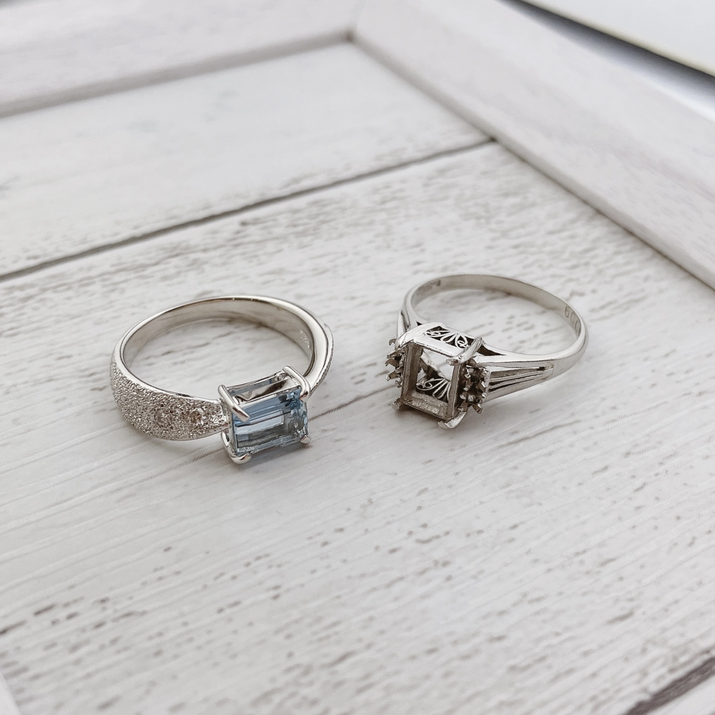 お客様がお持ちになられたのは、スクエアのアクアマリンがついたこちらのリングでした。