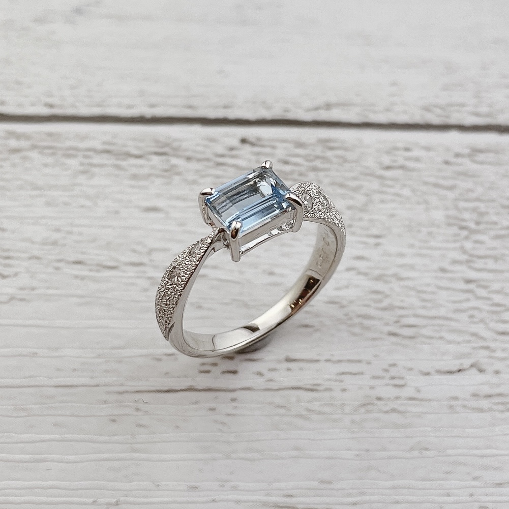 綺麗なお色味のアクアマリンは横向きにセッティングし、ボリュームを抑えたデザインです